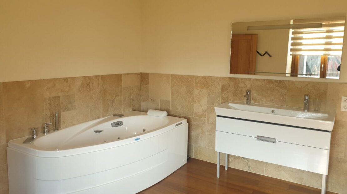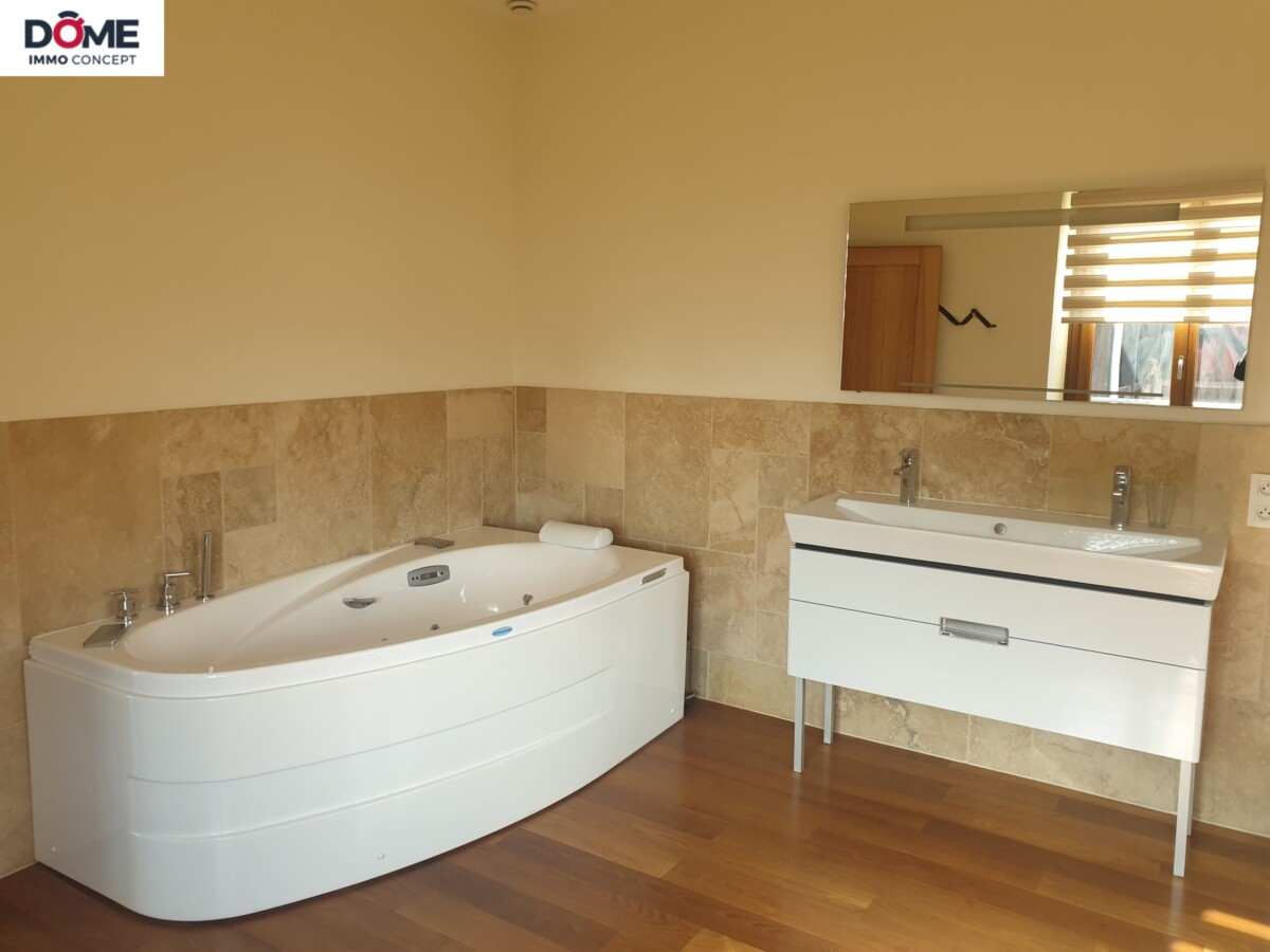 . 1 salle de bain, meuble double vasque, baignoire balnéo, cabine douche et WC séparé